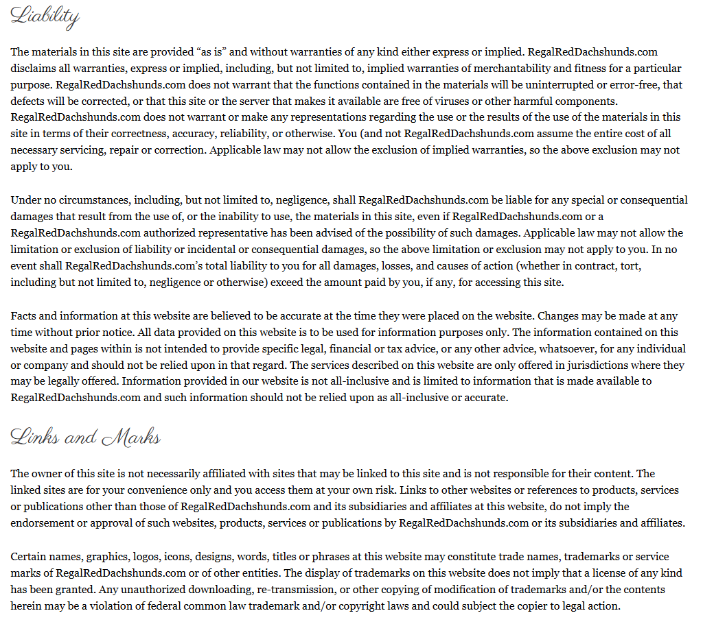 Under no circumstances, including, but not limited to, negligence, shall RegalRedDachshunds.com be liable for any special or consequential damages that result from the use of, or the inability to use, the materials in this site, even if RegalRedDachshunds.com or a RegalRedDachshunds.com authorized representative has been advised of the possibility of such damages. Applicable law may not allow the limitation or exclusion of liability or incidental or consequential damages, so the above limitation or exclusion may not apply to you. In no event shall RegalRedDachshunds.com’s total liability to you for all damages, losses, and causes of action (whether in contract, tort, including but not limited to, negligence or otherwise) exceed the amount paid by you, if any, for accessing this site.