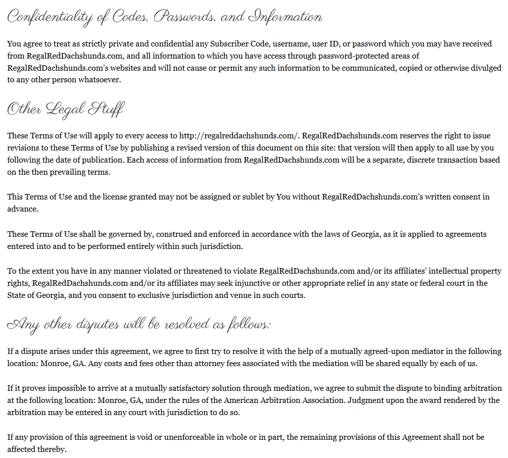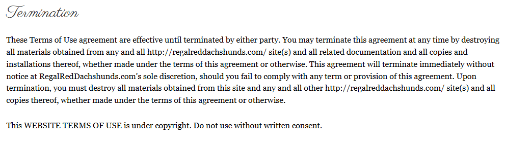 This agreement will terminate immediately without notice at RegalRedDachshunds.com’s sole discretion, should you fail to comply with any term or provision of this agreement.